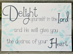 Delight yourself in the LORD And He will give you the desires and petitions of your heart. Literal Standard Version And delight yourself on YHWH And He gives to you the petitions of your heart. Adonnas sensational hand-lettering gives this scripture wall lettering the lovliness it deserves.